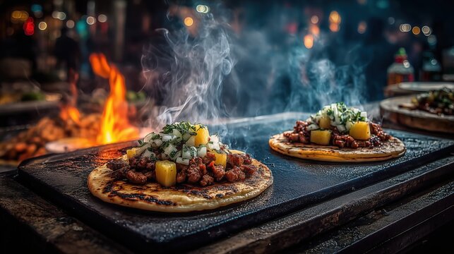 A feast for the senses crunchy tacos filled with sizzling meat and topped with a fiery array of peppers and es set against a backdrop of blazing flames. Are you brave enough
