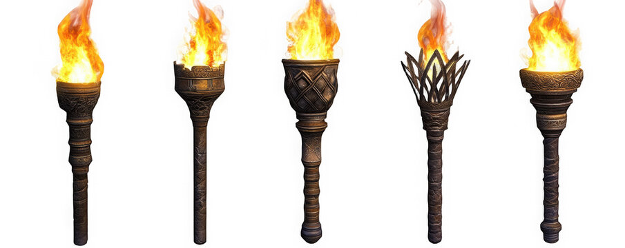 Ornate flaming torches in medieval style detailed and decorative lighting transparent background