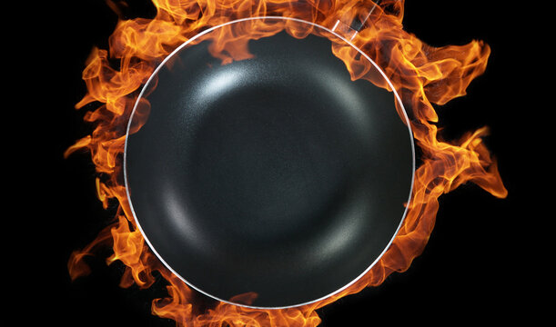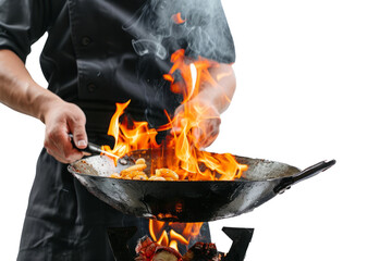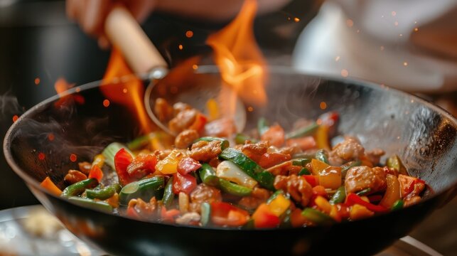 Freeze Motion of Wok Pan with Flying Ingredients in the Air and Fire Flames.