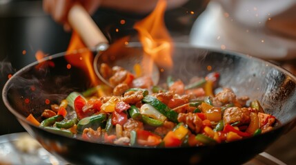 A vibrant vegetable stir-fry sizzling in a wok pan over high heat, with flames leaping around the pan, indicating high-temperature cooking and dynamic motion.