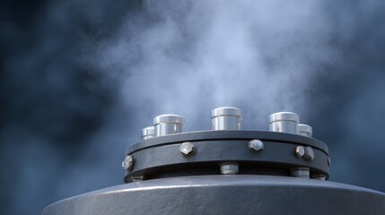 Close up of a silver metal valve assembly with bolts and flange attached to a large industrial tank
