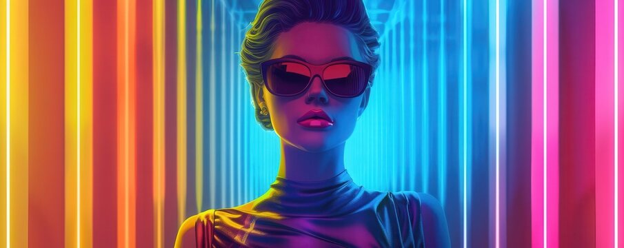 A woman in a retro dress and sunglasses, neon lights, vintage illustration, urban background, stylish flashback