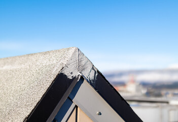 roof building: cornice with galvanized steel sheet, detail of the house on the part of the double-sided roof with ridge tiles.
