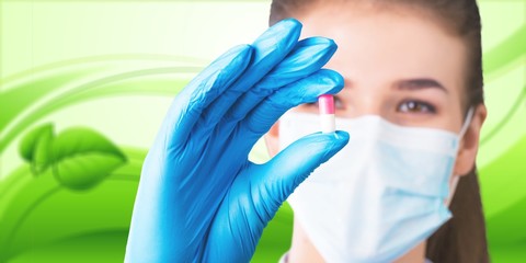 Glove with laboratory sample, laboratory assistant researching a vaccine