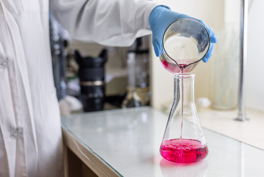 Scientist or medical in lab coat holding test tube with reagent, mixing reagents in glass flask in laboratory research.
