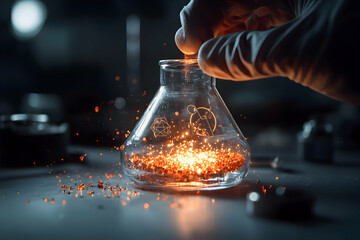 A scientific image features a glowing chemical reaction inside a flask. Experimentation is underway and sparks are flying illustrating innovation and discovery. Explore the science world!