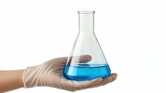 A gloved hand holds a glass beaker, a flask with ethanol biofuel in white background. Natural plant alternative fuel energy, oil renewable research in industrial laboratories