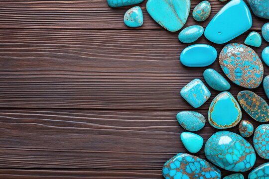 Artisanal turquoise jewelry displayed in a flat lay arrangement on a dark brown wooden surface with coral accents