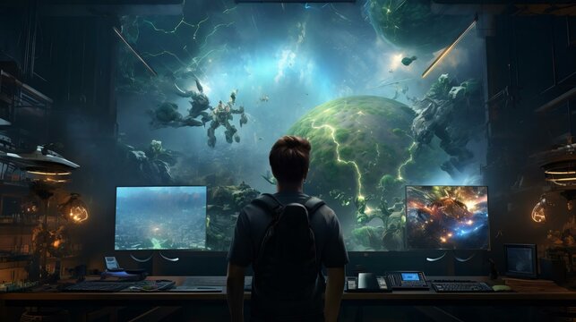 Hovering holographic control panels over planetary horizon displaying global data streams