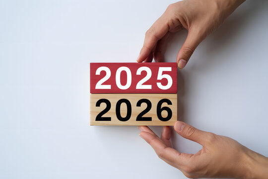 Minimalist flat lay of wooden blocks labeled '2025' and '2026' with hands, perfect for business planning, future projections, or minimalist design concepts.