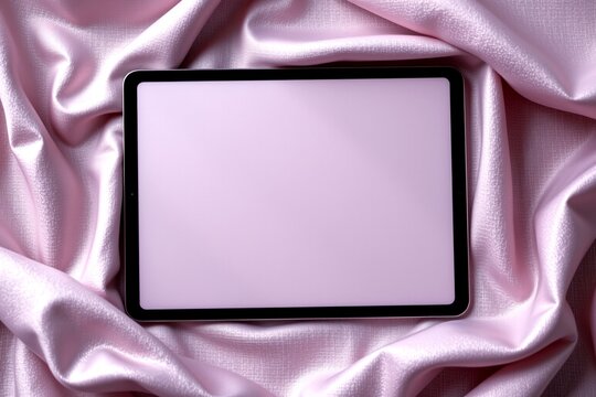 elegant flat lay of touchpad on a woven silk surface texture, with dusty lavender shades, indirect fill glow, minimal accents, high resolution
