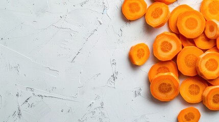 Fresh organic carrot slices on a white surface for salad with space for text flat lay