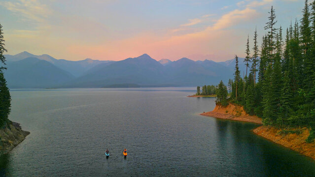 Aerial view of two paddle boarders on Hungry Horse Reservoir, MT.
