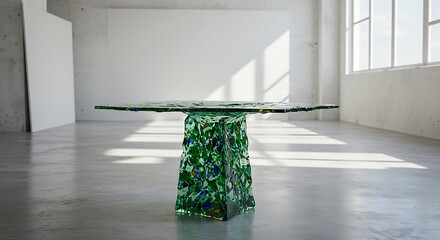 A striking table made from fragmented green glass with hints of blue and yellow, featuring a rough, organic base and a flatter top, stands in a brightly lit, minimalist industrial space.