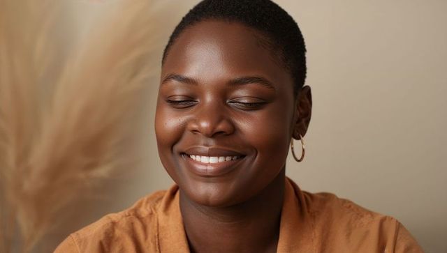 Indian woman smiling on balcony with nose stud and hoop earring, soft natural light