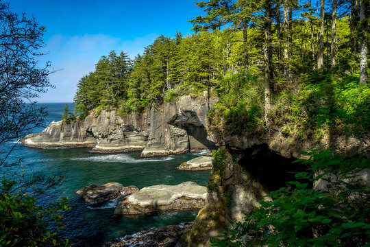 Lush green forest and rugged cliffs at Cape Flattery, Washington, showcase the wild beauty of the Pacific Northwest, where dense trees meet dramatic rocky landscapes.