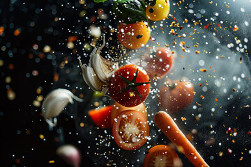 dynamic motion blur, splashes of seasonings in the air,