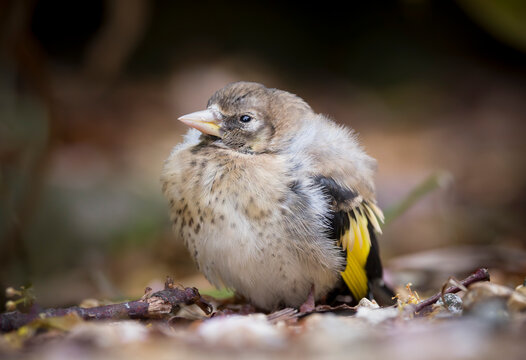 Baby bird, fledgling European goldfinch on ground, UK