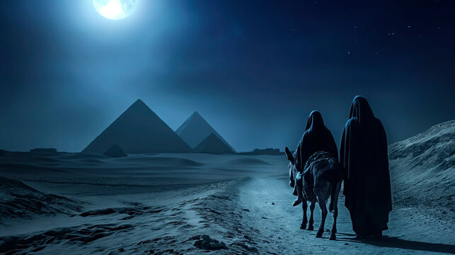 The Holy Family flees to Egypt. Nocturnal journey under the cover of darkness. Copy Space.