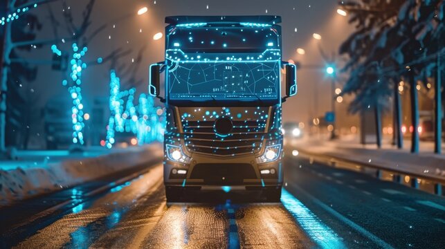 Cargo truck with route data overlay on highway, efficient distribution strategy, real-time logistics tracking.