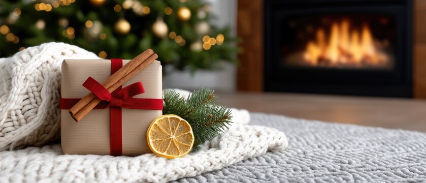 Merry christmas neon sign above roaring fireplace in cozy rustic log cabin interior
