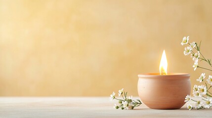 Beautifully crafted earthen lamp emitting a warm flickering flame surrounded by abstract circular patterns and lines that evoke a sense of floating energy  Accompanied by delicate flowers
