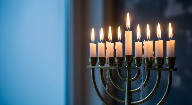 Nine flickering candles illuminate a golden menorah on a dimly lit background, celebrating Hanukkah and Jewish traditions.