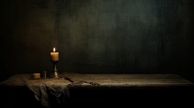 Tranquil glow of candlelight on wooden surface in dark room