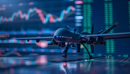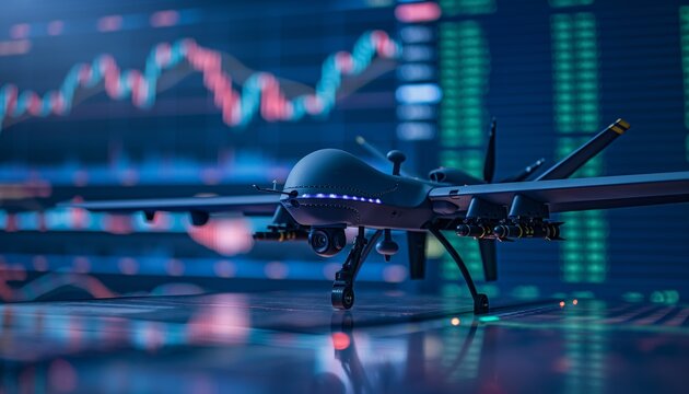 A military drone positioned in front of a background displaying stock market charts, combining modern technology with financial data visualization in an artistic approach.