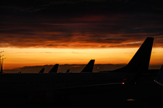 Colorful airplanes parked on the tarmac at sunset, with vehicles for flight operations or luggage transport in the foreground. Beautiful airport scene with an empty field and sunset background.