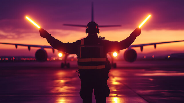 Airport ground crew member guiding an airplane at sunset with signal wands, creating a silhouette effect. Image made using Generative AI.
