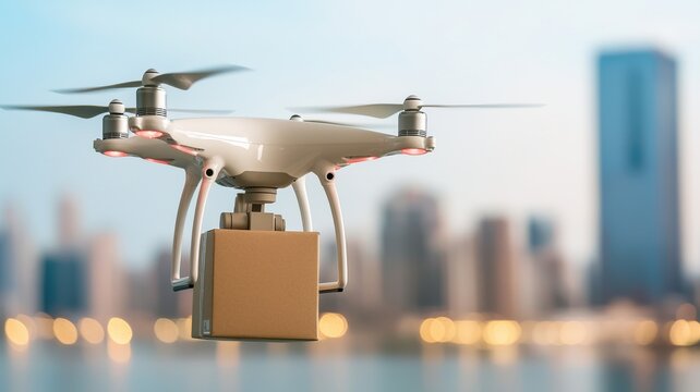 Drone delivering a package over a city skyline background.