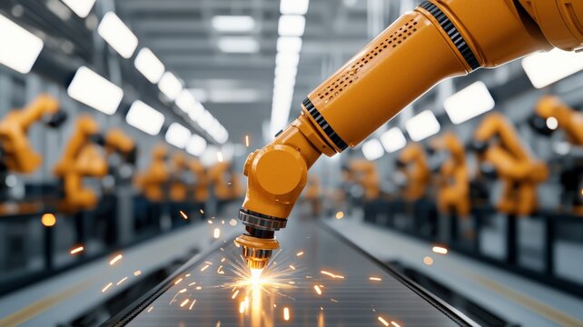 efficiency optimization technique concept. Robotic arm welding in a modern industrial setting with sparks flying.