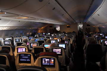 Interior of a jet airplane on a long international flight with TV screens on the back of seats