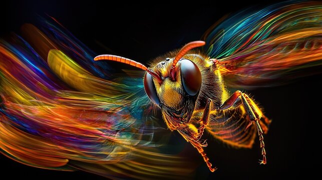 Stunning macro close-up of a hornet in dynamic flight with colorful trails