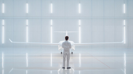 focused aeronautical engineer observes sleek aircraft model in modern wind tunnel facility, showcasing innovation and precision in aviation design
