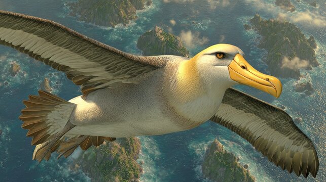 Detailed illustration of a flightless bird soaring above a tropical island landscape.