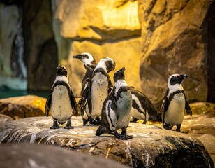 African penguin, beach or nature with environment, summer or landscape with aquatic flightless birds. Seaside, ocean or animal with ecology, habitat or conservation for endangered species or wildlife