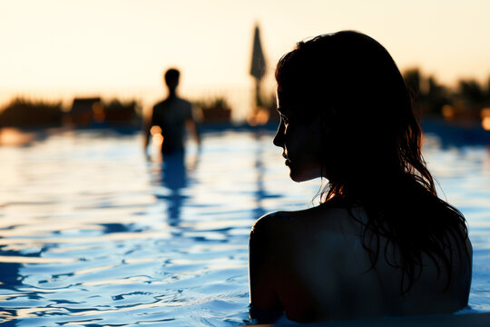 Vacation romance, fling or flirt. Woman and man in pool at sunset in hotel resort. Caribbean paradise. Bad holiday or travel problem. Cheating, infidelity or conflict. Tourist with stress.