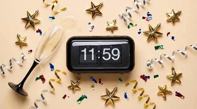 New year's eve concept with flip clock showing 11:59 surrounded by champagne glass golden stars and confetti on a light beige background with copy space