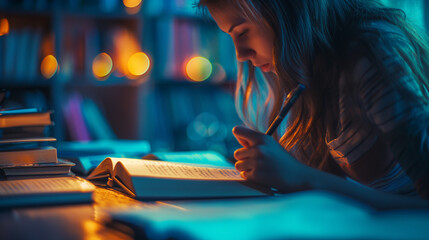 Focused student studying and taking notes indoors. A teen girl wearing glasses studies intently at a desk, flipping through a book and writing notes in a quiet room.