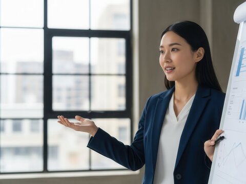 Smiling dark-skinned girl dressed in blue shirt glasses stands next to board holding marker in hand drawing graphs writing out diagrams looking into camera beautiful Asian woman observes situation