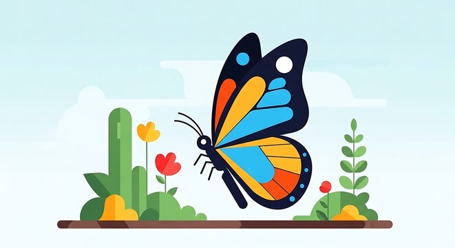 Stylized butterfly flitting amidst wildflowers, embodying whimsical charm and the essence of spring in a bright,