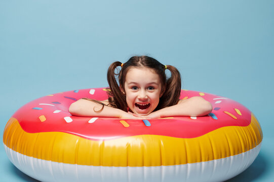 Cute little girl in swimsuit, poses inside a swim ring, blue background. Summer entertainment, holiday and beach concept