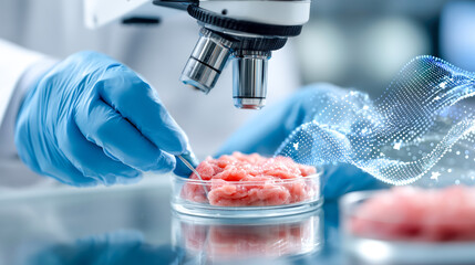 Lab glove microscope petri dish cultured meat synthetic protein food science biotechnology magnifier lab tool sterile method guide focused hopeful mood in clean lab while dotted wave arrows float
