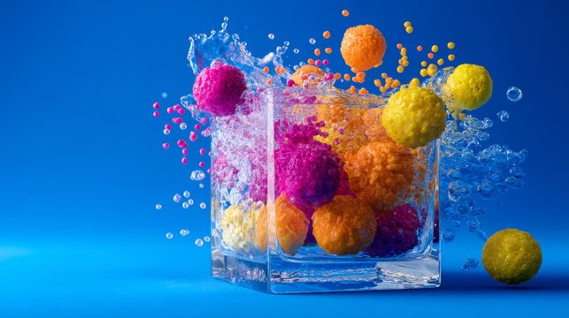 Bunch of colorful balls are floating in the air. The colors are bright and vibrant, creating a fun and playful atmosphere