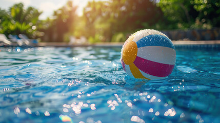 Diverse friends enjoying poolside leisure with colorful beach ball scene