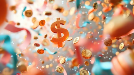 Vibrant Floating Coins and Banknotes, Symbolizing Wealth and Energy  .