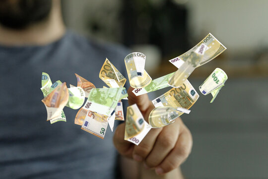 Close-up of a hand with euro banknotes floating around it.  Concept of finance, wealth, or success.