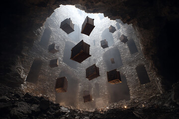 Mysterious cave with floating boxes and light shining through the hole in the ceiling above the dark space